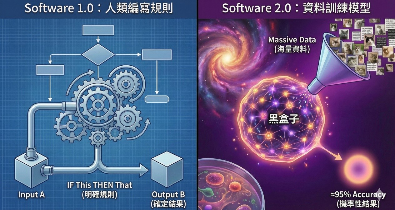 - 從「建築師」變成「老師」: 以前我們像建築師,精準規劃每一塊磚頭的位置;現在我們像老師,提供教材(資料集)給學生(模型),我們無法控制學生腦袋裡(神經網絡)的神經元具體是如何連結的,我們只能通過考試結果(驗證集)來評估他學得好不好。